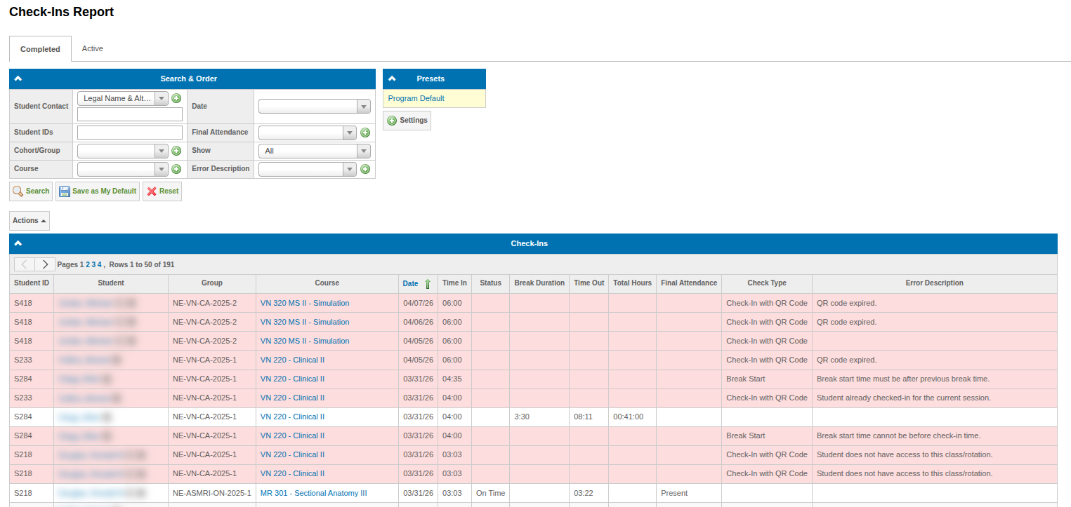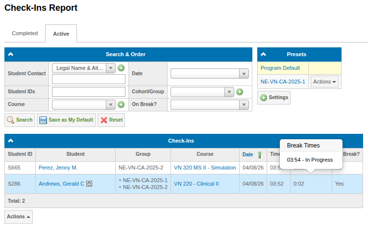 The Active tab displays in-progress sessions: students who have checked in but not yet checked out while the checkout window is still open: