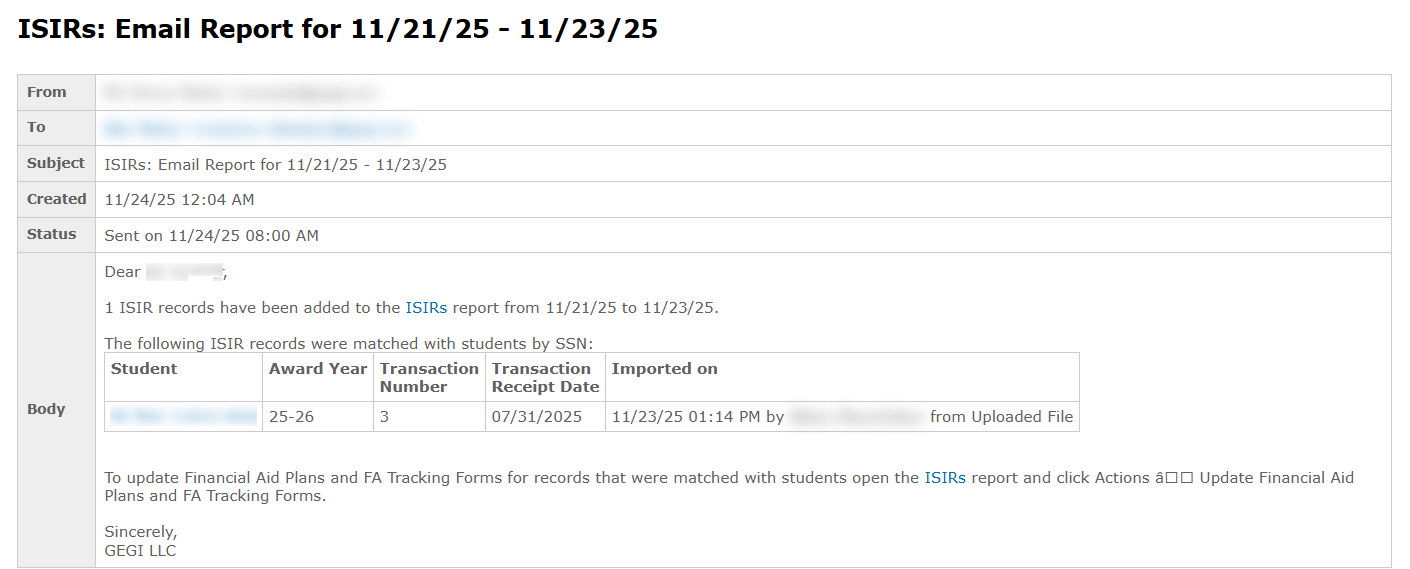 Financial Aid advisors receive a daily notification with the list of newly imported ISIRs for their assigned students: