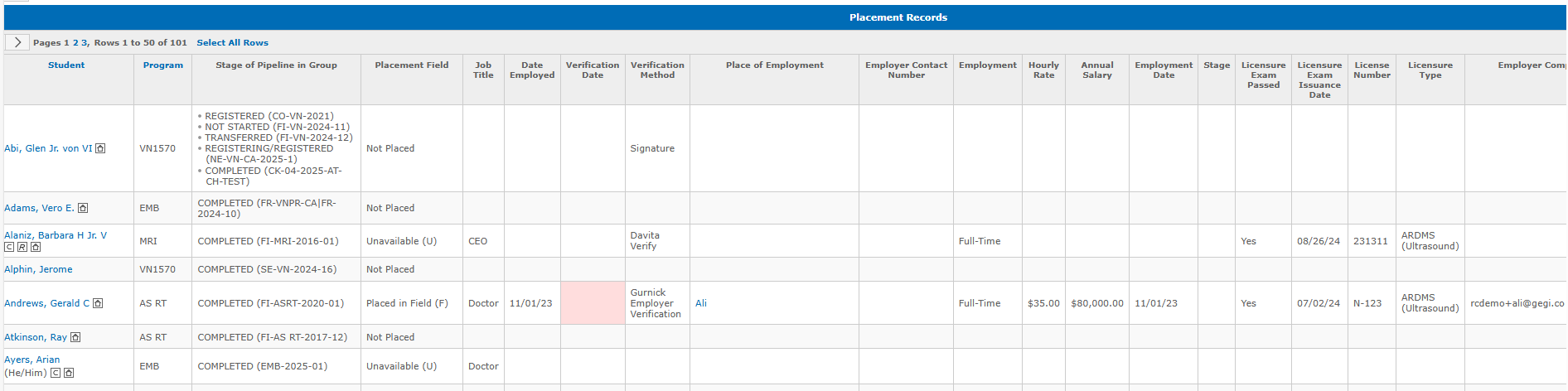 The Placement → Placement Records page is designed to generate compliance-ready reports. It provides tools for filtering, grouping, and analyzing placement data, along with predefined reporting presets and actionable features.
