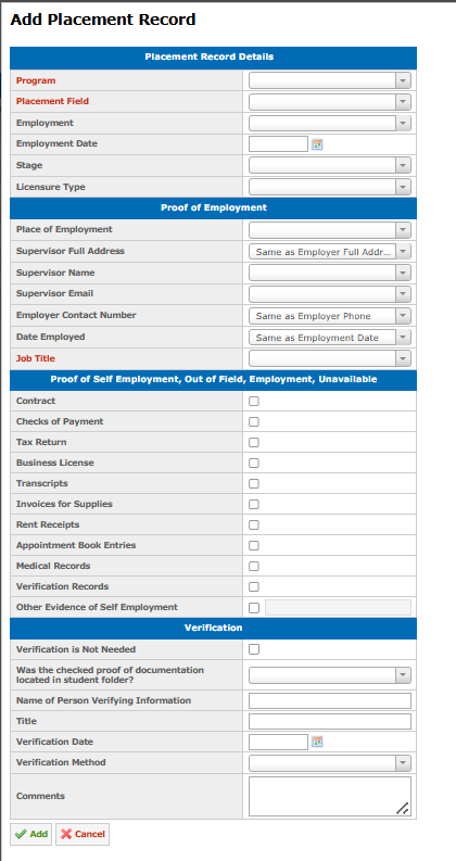 Fill out the new placement information. The fields highlighted in red are required and cannot be empty. Click Add to save the new record. Click Cancel to discard changes.