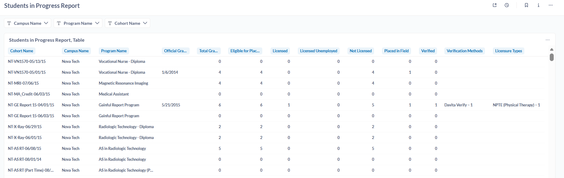 The Students in Progress Report provides a comprehensive view of the placement progress by cohort. This report helps to track student placement outcomes and verify the employment status across different programs and campuses. The report focuses on students who are available for placement (excluding those marked as unavailable) and displays key metrics to monitor the placement progress and licensure status.
