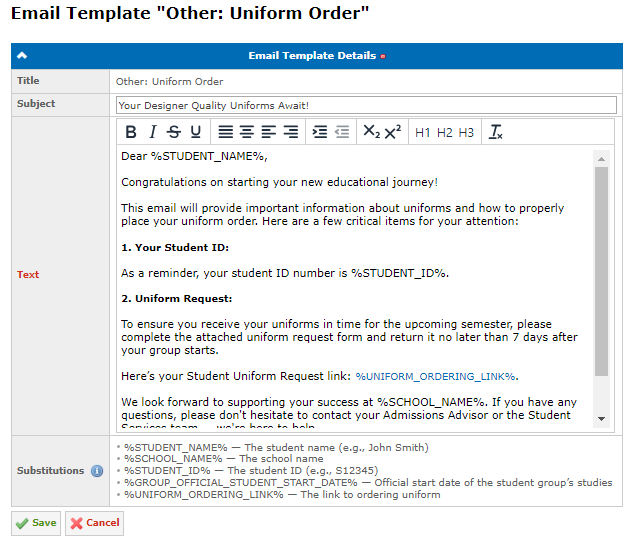 Once the link is successfully generated, students receive an email with their personalized ordering link. The email is generated using the Other: Uniform Order email template (Admin → Email Templates):