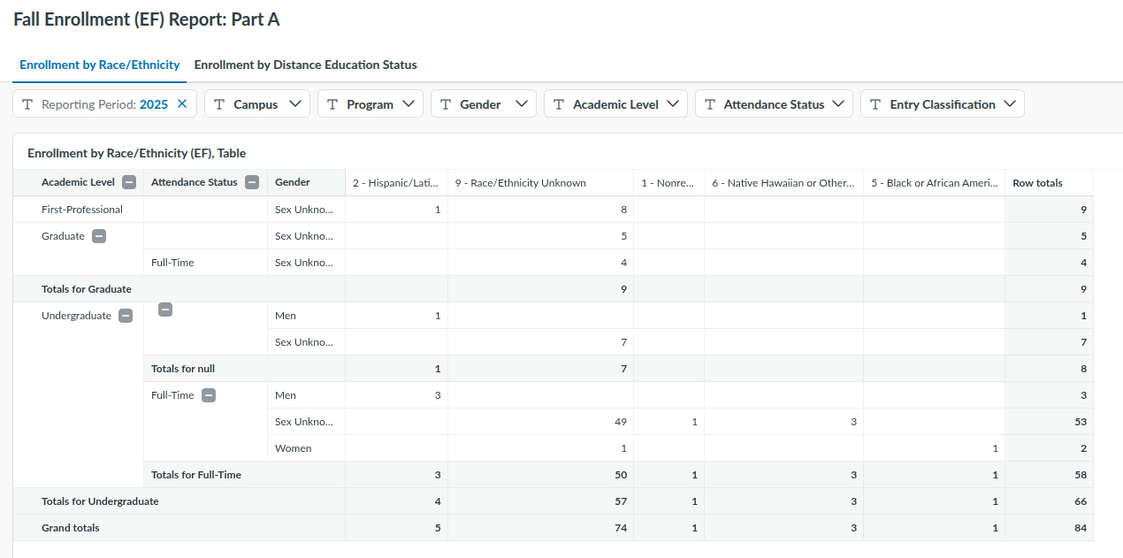 - Includes two tabs: one for race/ethnicity (using the "IPEDS Ethnicities" list) and one for distance education status.