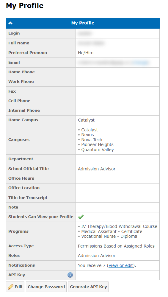 The My Profile page (Main → My Profile) displays your account information, including your name, contact details, campus assignments, roles, and notification settings.