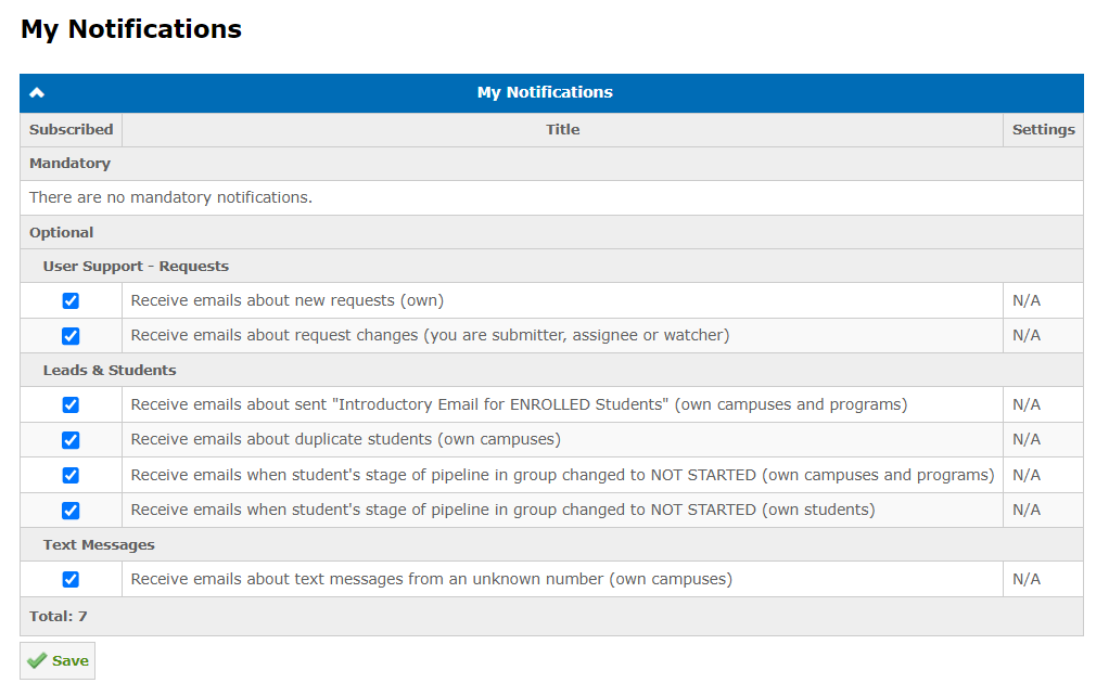 To view or update your email notification subscriptions, click the link in the Notifications row. The My Notifications page lists all available notifications grouped by category. Check or uncheck items to subscribe or unsubscribe, then click Save: