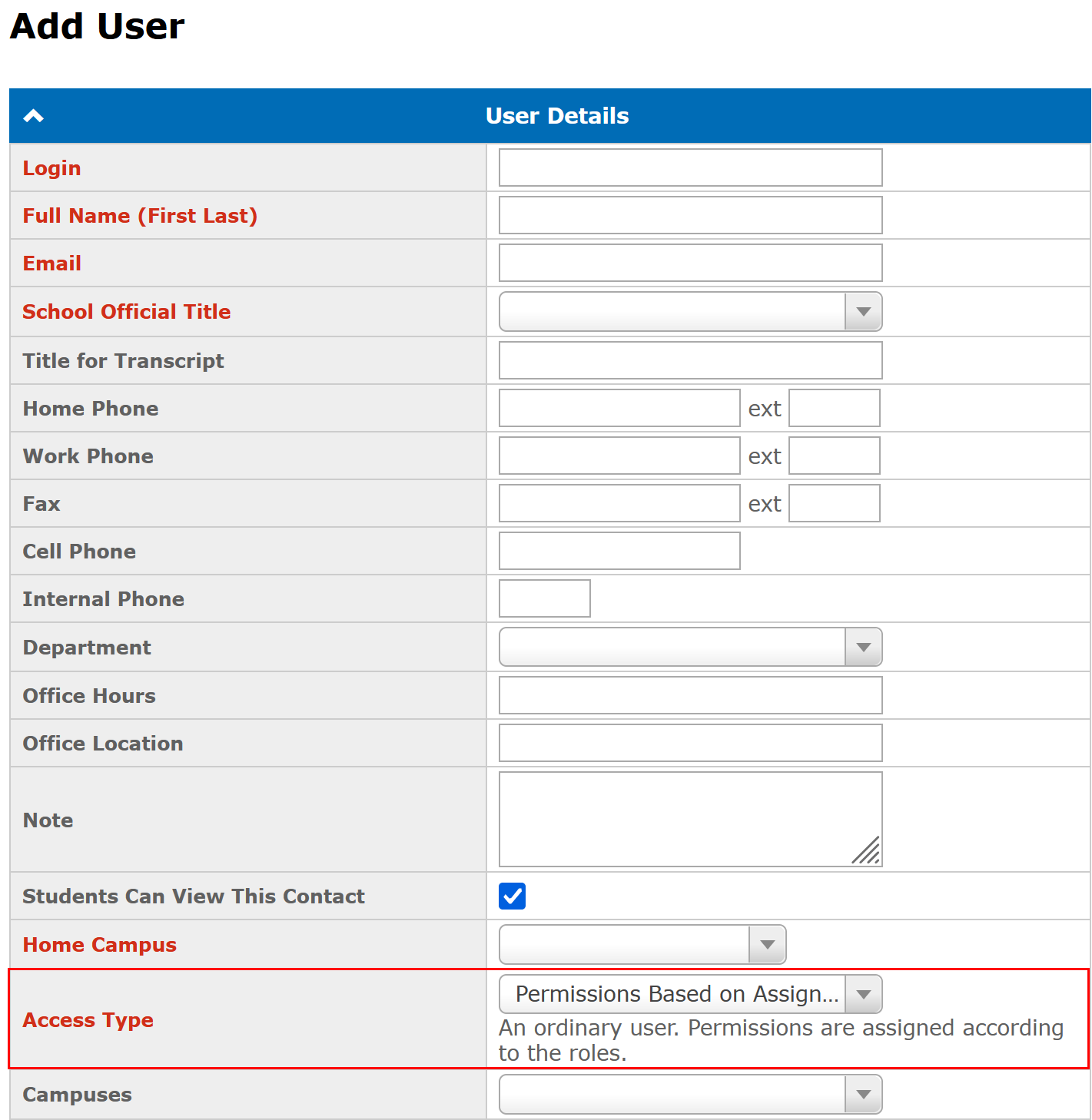Along with the Access Type users must also select Campuses field (available in multi-campuses mode only).