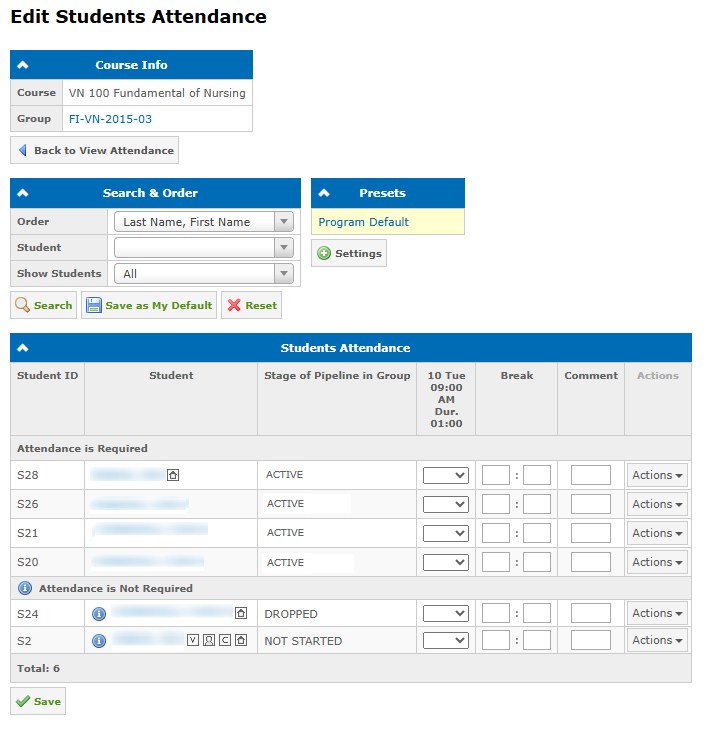 - This will open the Edit Students Attendance page. Log the attendance and break duration in hours and minutes for the selected classes and click the Save button.Attendance can be of the following types:
