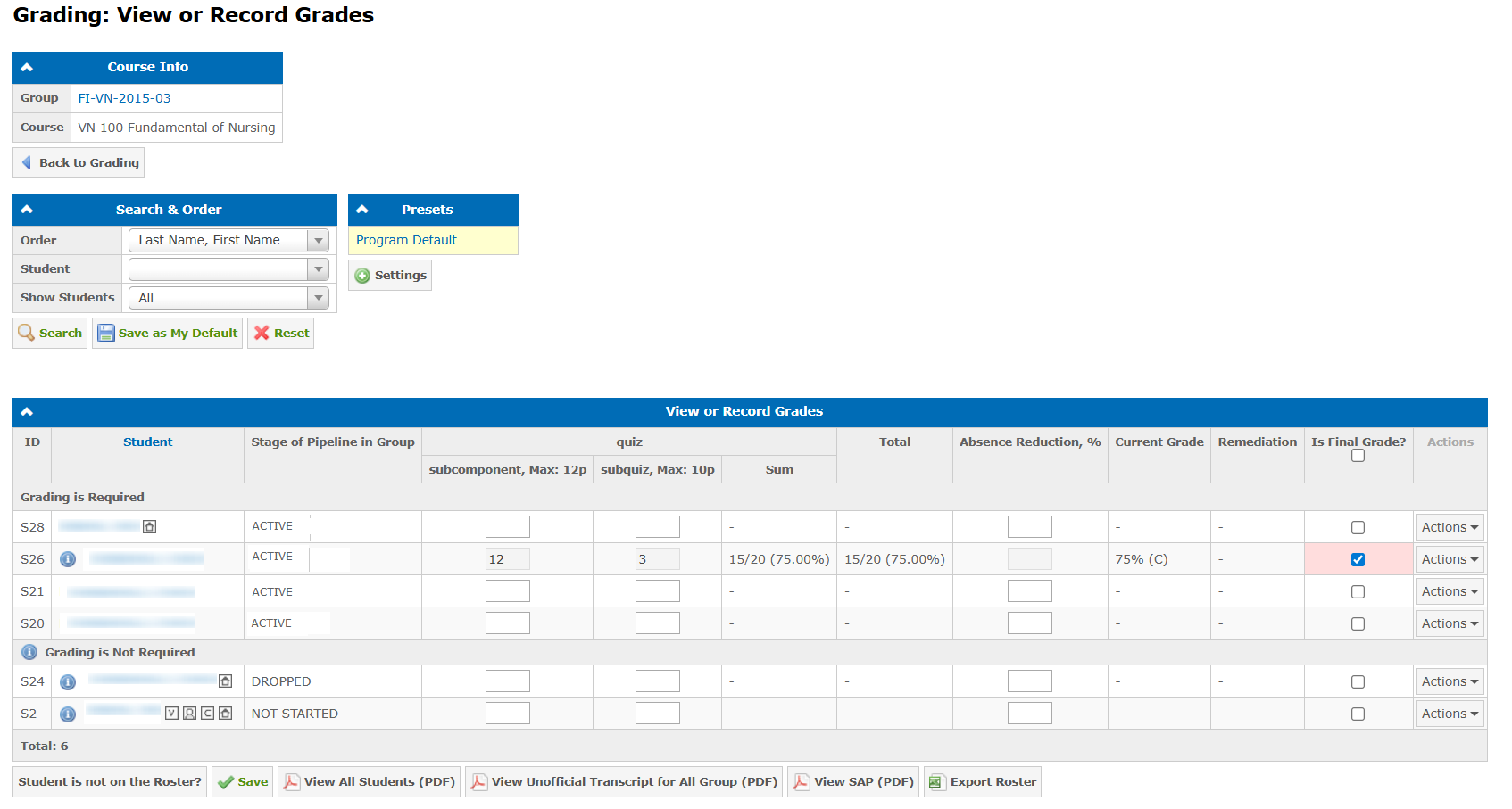 - Attendance Is Not Required — students with a non-active pipeline stage (DROPPED, TRANSFERRED, etc.) and students who completed the course in a previous group.